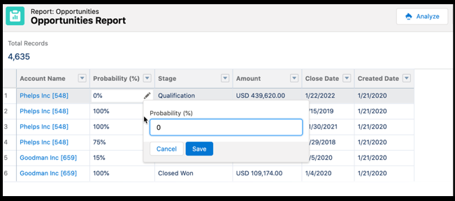 Inline-Bearbeitung für Salesforce-Berichte