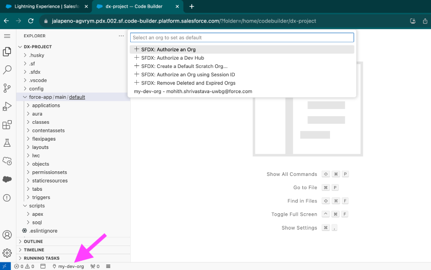 Dank des aktuellen, vorinstallierten Salesforce-Befehlszeilentools (sf v2) ist das Code Builder-Terminal einsatzbereit. Entwickler können problemlos sämtliche Salesforce-CLI-Befehle ausführen und sogar Plugins von Drittanbietern für die Salesforce-CLI installieren. Der Zugriff auf das Terminal ist so unkompliziert wie das Umschalten über die Befehlspalette.