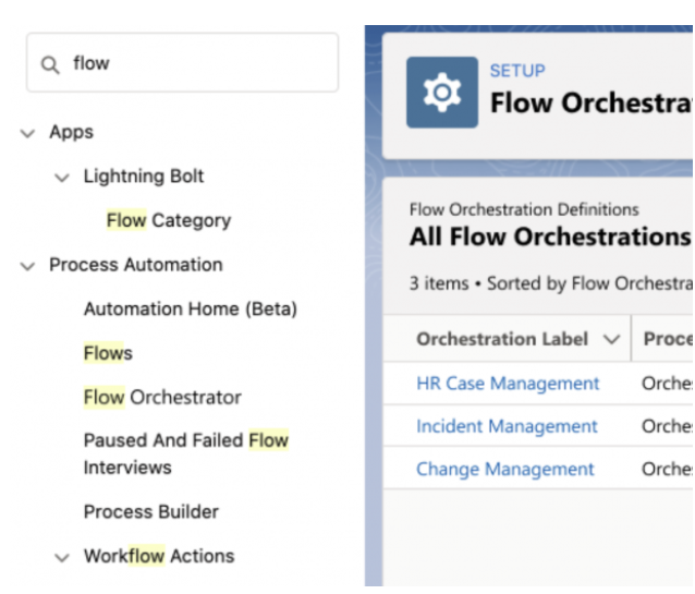 Um eine neue Flow-Orchestrierung zu erstellen, müssen Sie im "Setup" in den Bereich "Flows" gehen. Anschließend wählen Sie den Flow Orchestrator und den Orchestrierungstyp aus der Liste aus und klicken dann auf "Weiter".