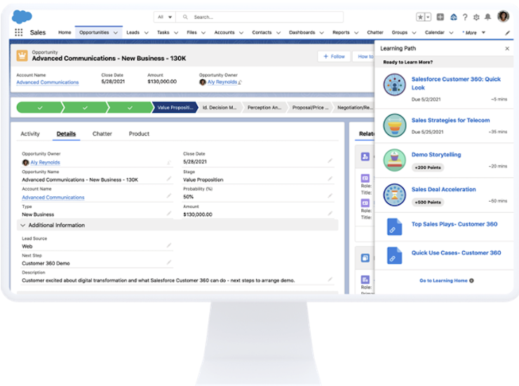 Mit Salesforce Learning Paths können Lerntechnologien jetzt direkt in Salesforce integriert werden, um das Lernen am Arbeitsplatz zu ermöglichen, sodass die Lerninhalte zur Verfügung stehen, genau dort, wo Sie es brauchen.