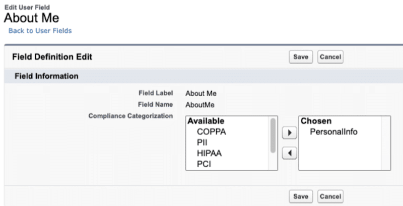 Sie verwalten jetzt über ein FieldSet welche Felder als PII gelten, anstatt die Compliance-Kategorisierung zu verwenden. Wählen Sie im Objekt-Manager für das Benutzerobjekt ein Feld aus. Bearbeiten Sie das Feld und wählen Sie aus, ob die Compliance-Kategorisierung auf „PersonalInfo“ gesetzt werden soll. Sobald ein Feld als „PersonalInfo“ festgelegt ist, wird es für andere externe Benutzer ausgeblendet.