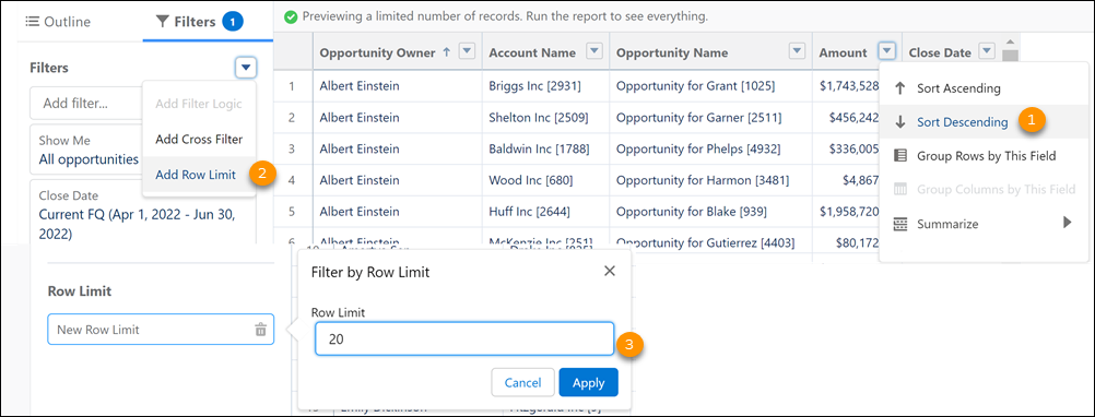 Sie können jetzt Zeilenbegrenzungen in Ihren tabellarischen Berichten festlegen und diese als Quelle für eine Dashboard-Tabelle oder Diagrammkomponente einbeziehen. So gelangen Sie schnell zu den relevantesten Datensätzen und vermeiden unnötige Verarbeitungszeit.