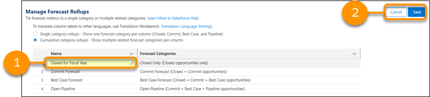 Lange ist es mit Veränderungen an den Prognosen her. In der Version Summe´22 können Sie jetzt kumulative Rollups für Prognosen anzeigen, um die Prognosen Ihres Unternehmens widerzuspiegeln. Bisher wurden Bezeichnungsänderungen nur für Einzelkategorie-Rollups angezeigt. Außerdem gibt es für Prognoseeinstellungen die Schaltfläche zum Speichern und Abbrechen.