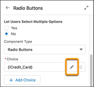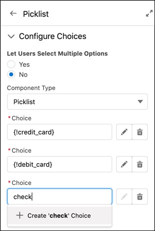 Auswahlmöglichkeiten können direkt in der Bildschirm-Flow Komponente angelegt werden.